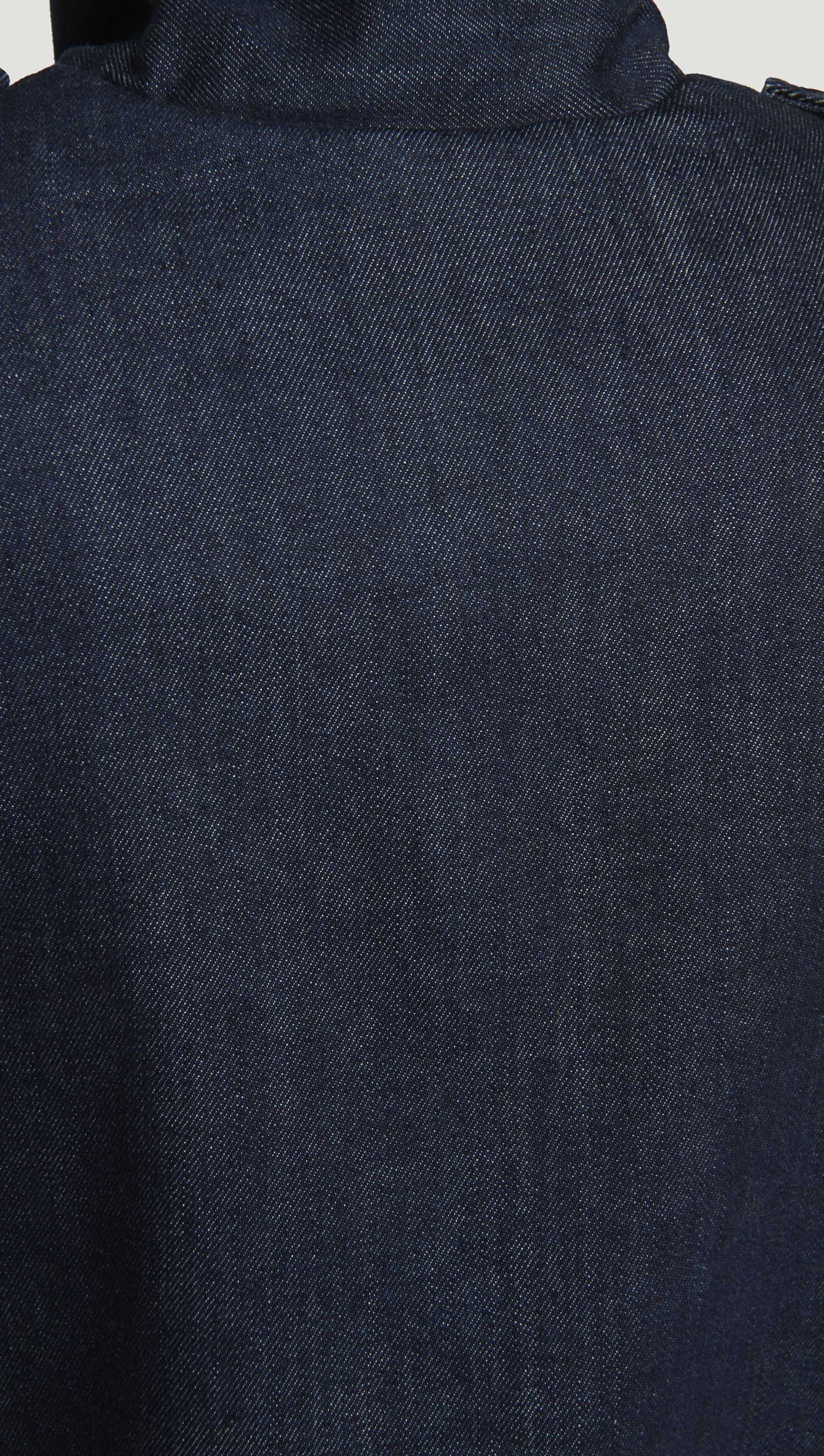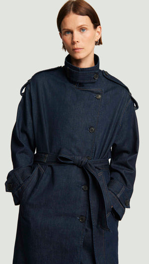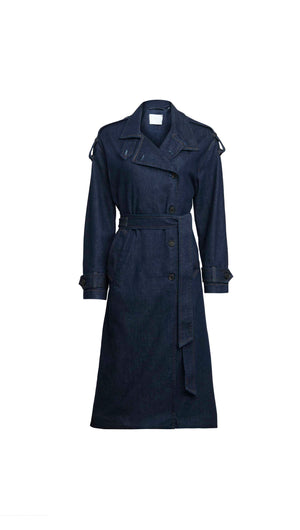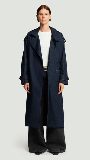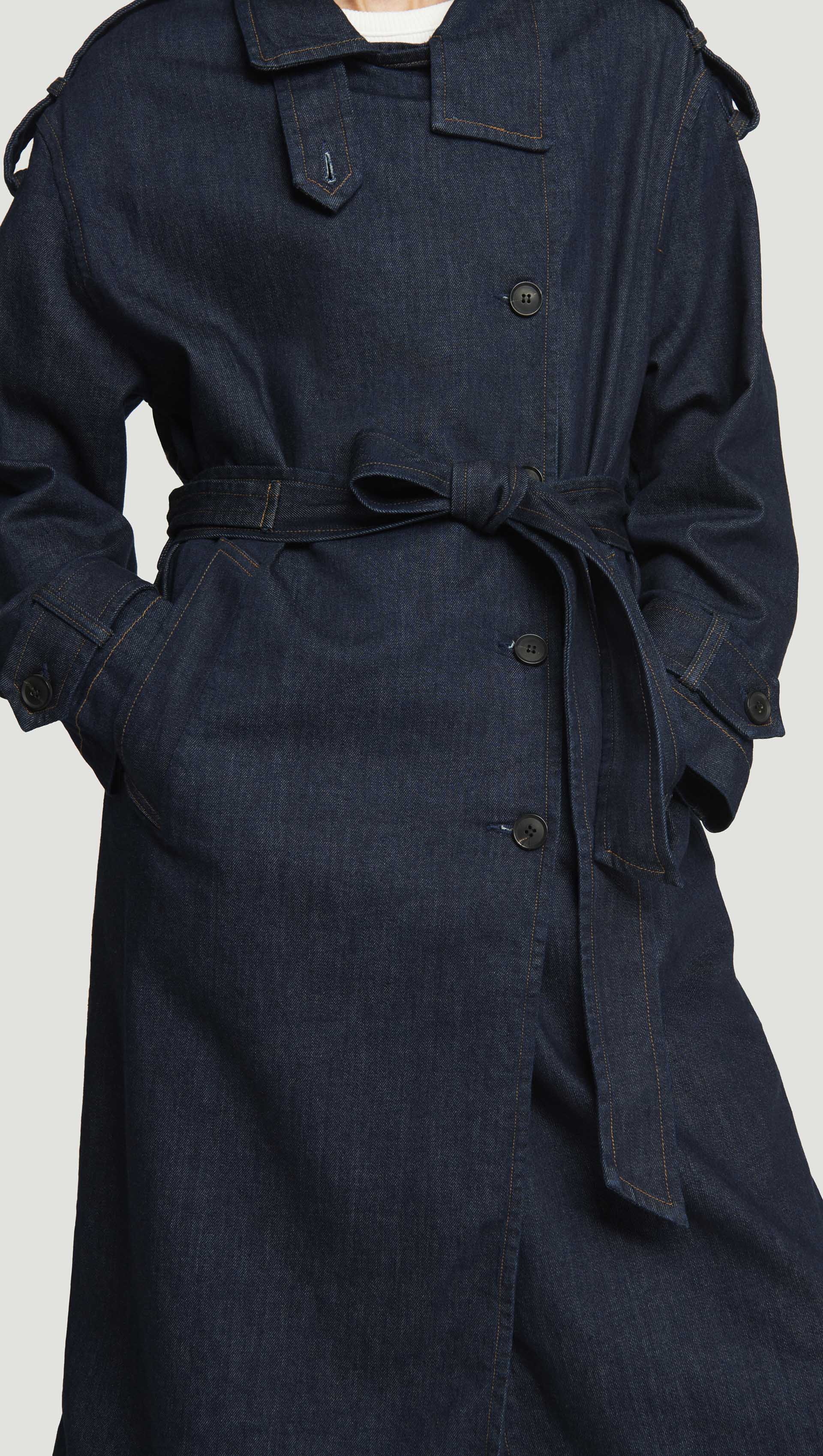 A modern interpretation of a classic silhouette. Crafted from dark indigo regenerative denim, this long trench features a button-front closure, epaulets, and a self-tie belt for a cinched waist. Structured yet fluid, it’s a timeless layer that balances strength and softness in equal measure.