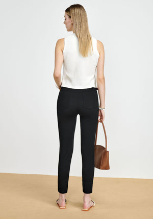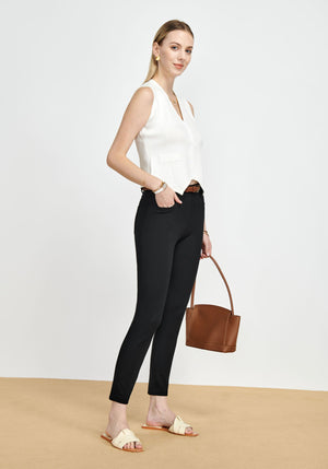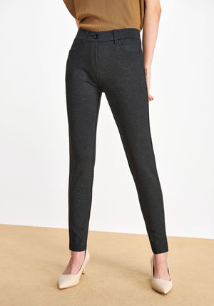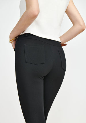 Mid-rise with elastic waistband, belt loops, faux fly, unfunctional button, pull-on style, skinny leg, multiple inseam lengths to fit different body types. The slimming fit cut hugs your body from hip to ankle, and the stretchy fabric allows you to move freely.