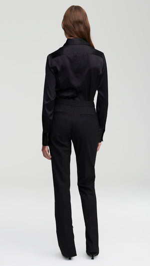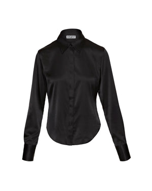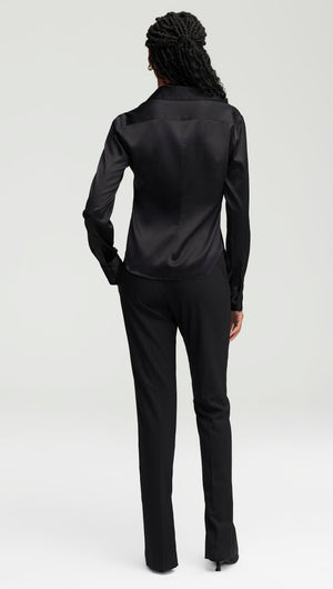 Made of a stretchy silk satin, this slim fit blouse is sure to become a daily favorite. The lightweight, airy silhouette allows for comfortable movement and natural stretch. Easy to tuck and style with your favorite pair of trousers or skirt.