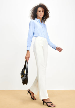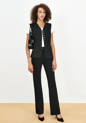 Flat front, non-functional button, belt loops, and faux fly make pants dressy, ideal for office work, meetings, teaching and business casual. Women's slacks with mid-rise and slight flare cut also fit casual wear.