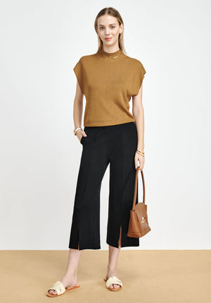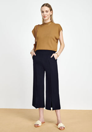Pull-on style, loose fit, high waisted, 2 center seams on the front and the back, and slits design on the leg opening, making wear-to-work pants capris basic but stylish.